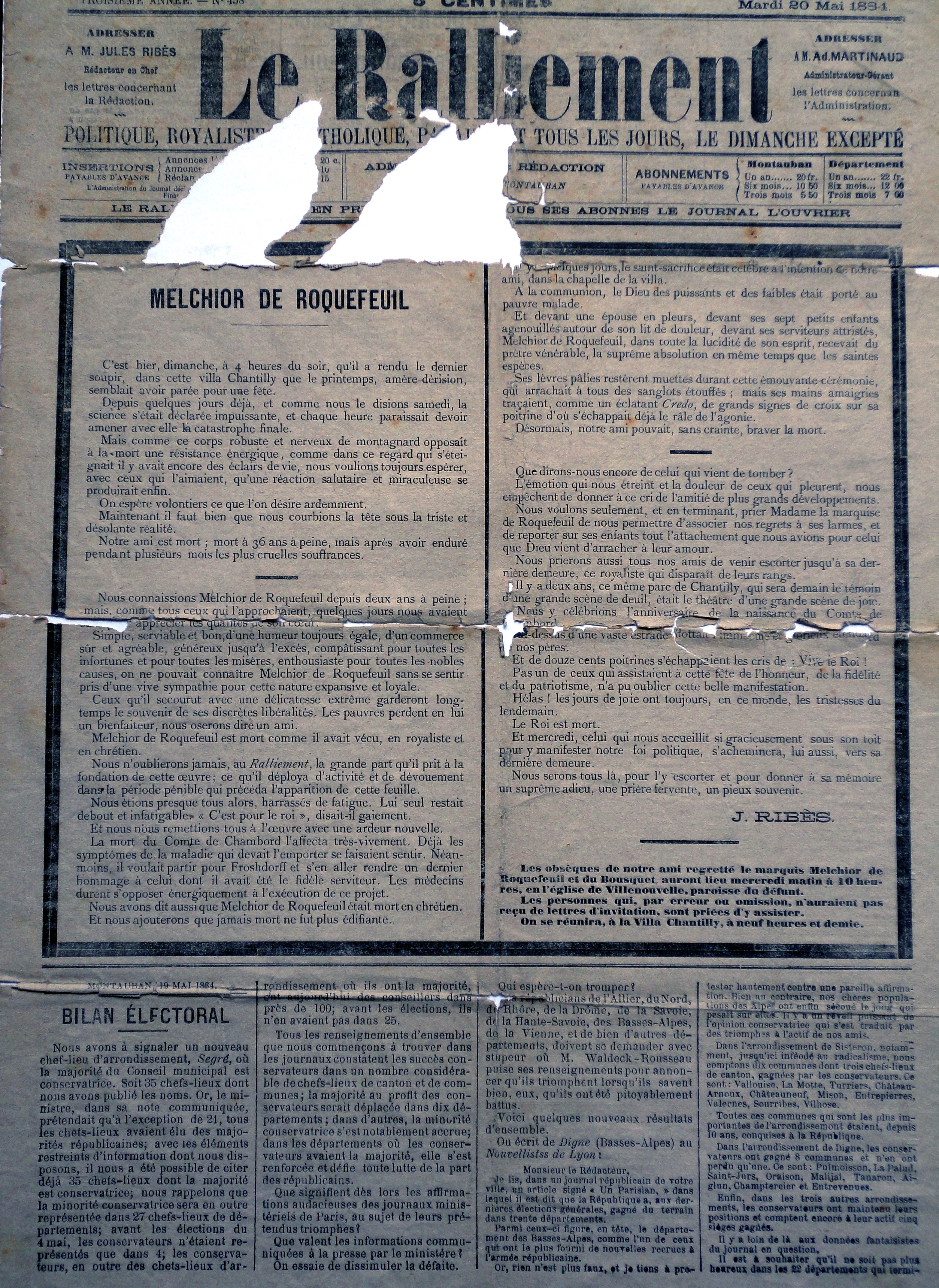 Mardi 20 mai 1884 – Le Ralliement, journal politique, royaliste et catholique relate le décès de Melchior de Roquefeuil, à l’âge de 36 ans dans sa maison de Montauban (« Villa Chantilly »).